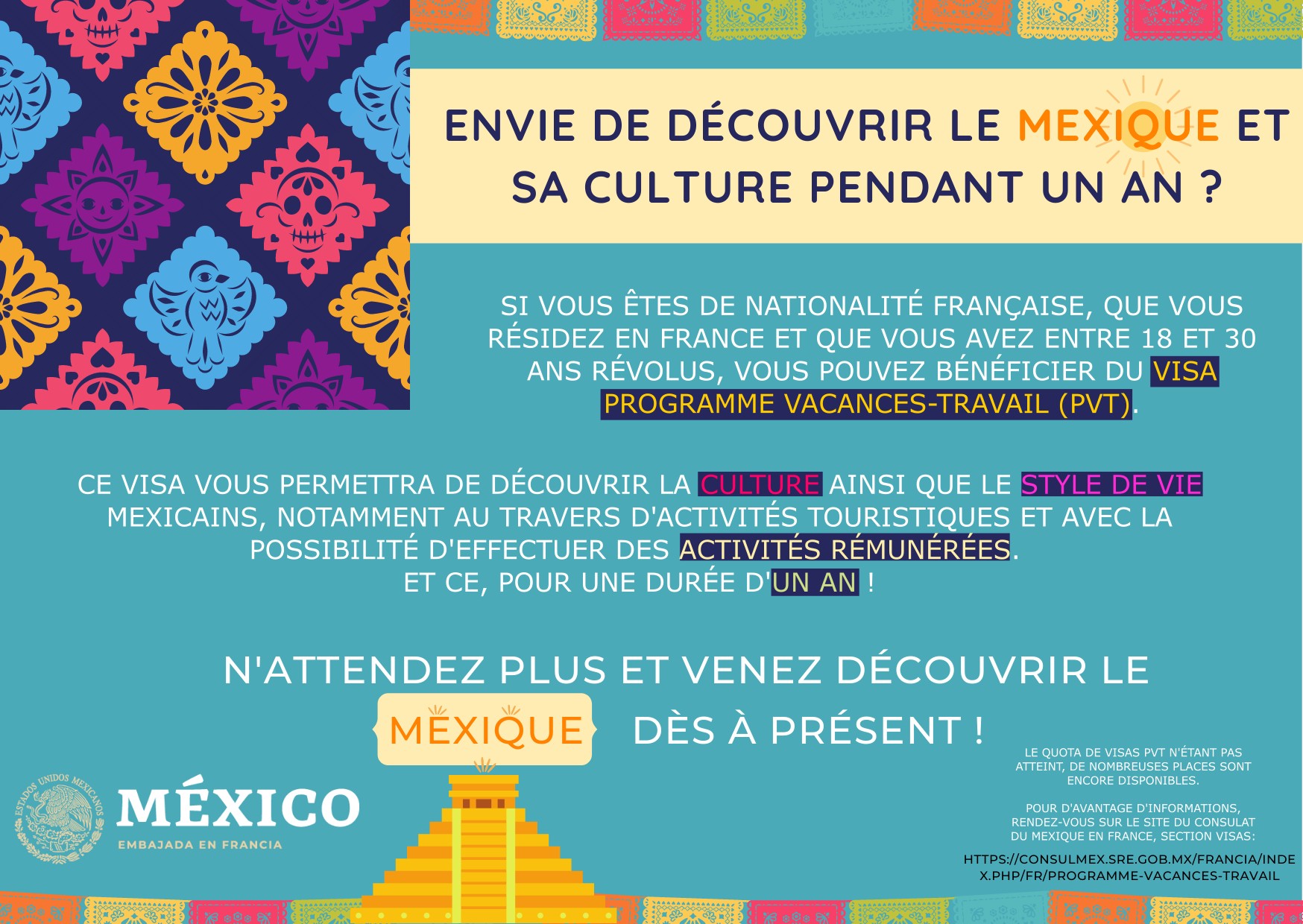 L'Ambassade du Mexique en France a créé une infographie sur le Visa PVT permettant aux jeunes de découvrir le Mexique, tout en effectuant des activités rémunérées. -