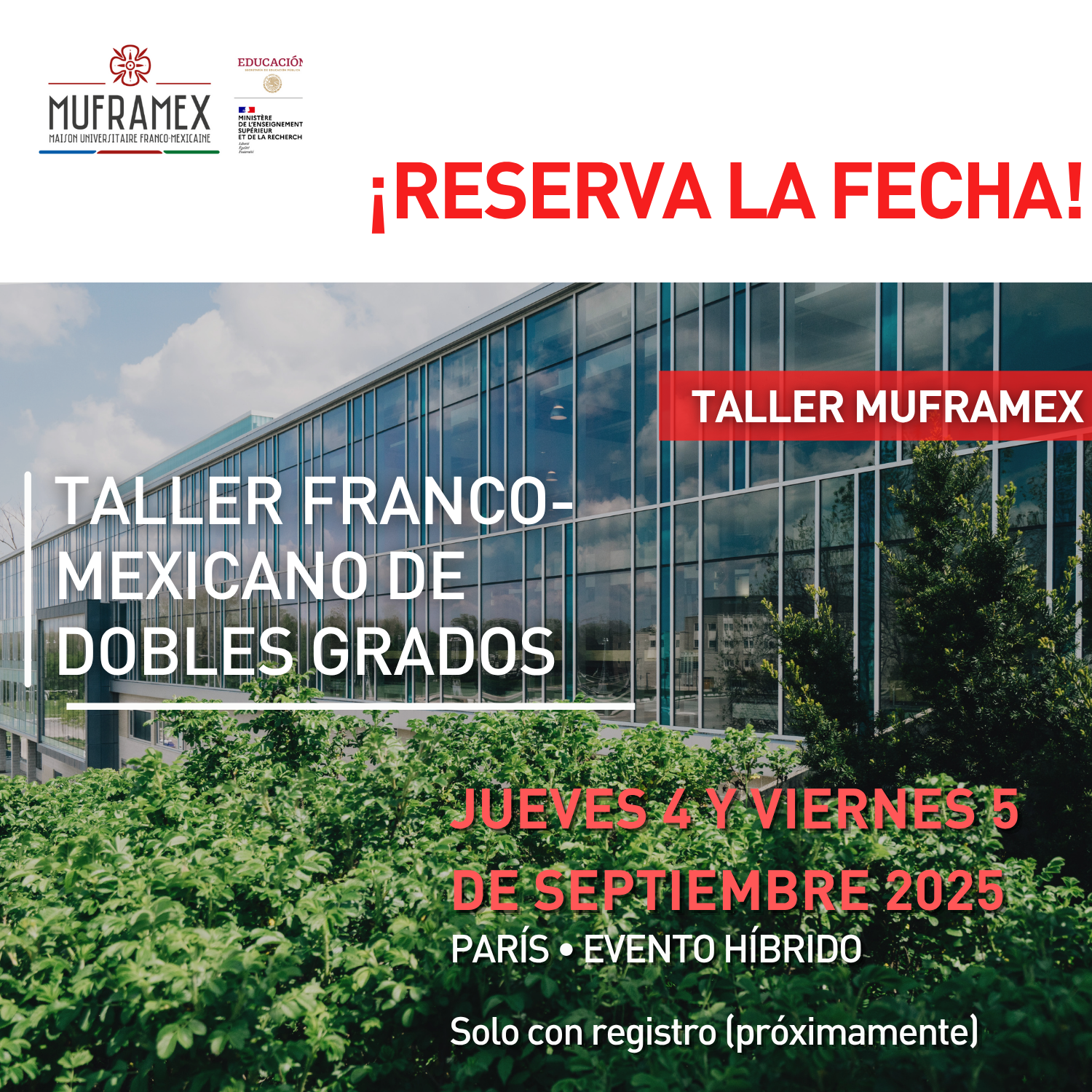MUFRAMEX organiza, en colaboración con instituciones mexicanas y francesas, un evento híbrido de dobles titulaciones franco-mexicanas, los días 4 y 5 de septiembre de 2025 en París.